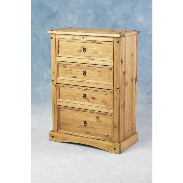 The Corona range is a popular collection that is made in a traditional Mexican style. The chest is both attractive and generously sized. It includes four roomy drawers with latch-style handles and a handy flat top surface. This ethnic-style chest provides a unusual and compact storage solution to your bedroom.