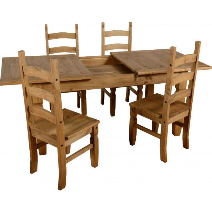 The Corona range is a truly stunning furniture collection. The dining set comprises of one table with an artfully designed table top and four matching chairs. For real flexibility when entertaining, this table has the ability to extend when needed. Please note that there are also matching Corona items available to view and purchase on this site.