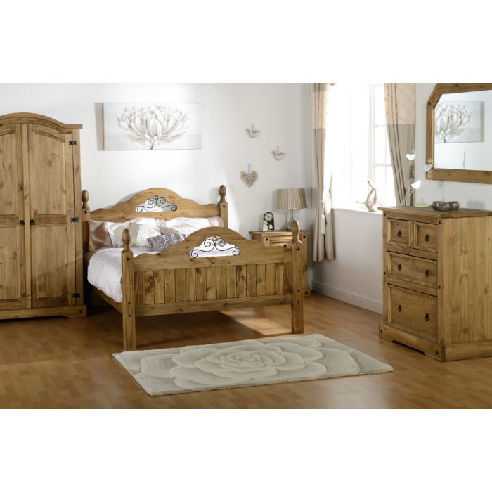 The Corona Scroll Double Bed is a traditional style bed that has an authentic ethnic appeal. The bed features carved wooden posts on both the head and footboard long with an additional metal scroll detail to give it extra charm. This bed is perfect for the traditional style country home.