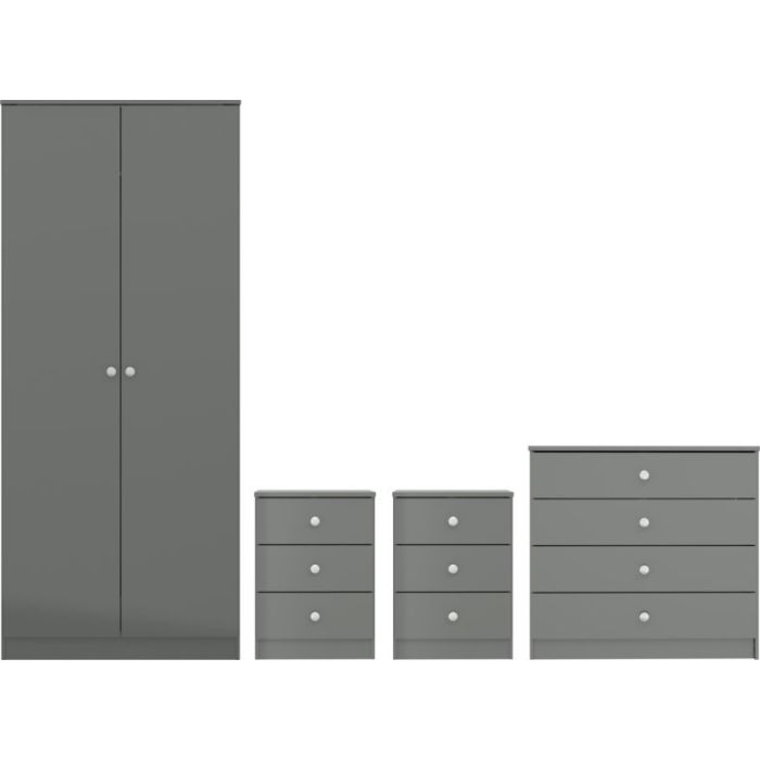 The Denver Grey Gloss Bedroom Set with 2 Door Wardrobe, two 3 Drawer Bedsides, and a 4 Drawer Chest is a contemporary collection designed to bring style and functionality to your bedroom. The wardrobe features a sleek grey high-gloss finish and offers practical storage with a full-length hanging rail and a fixed shelf above, perfect for organizing clothes and accessories. The two matching 3 drawer bedsides provide convenient storage for your essentials, combining spacious drawers with a minimalist design. Completing the set, the 4 drawer chest offers ample room for folded clothing, linens, or personal items. Finished with sleek metal handles and clean lines, this Denver Grey Gloss set creates a polished and cohesive look that effortlessly enhances any modern bedroom.