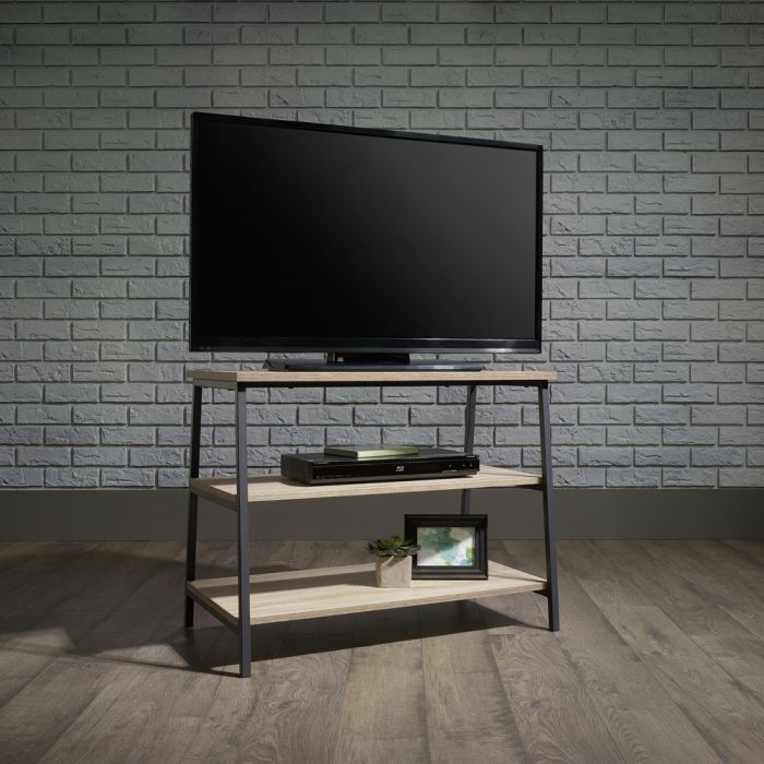 Industrial Style TV Stand with a durable black metal frame and charter oak effect shelves that can hold up to a 36" TV.