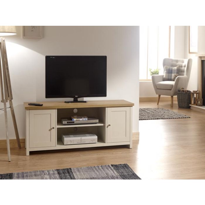Our large Lancaster TV cabinet has all the features of the smaller version with a double shelf, rear cable entry and adds even more storage space with a second storage cupboard. Like the rest of the Lancaster range it is available in a modern soft grey finish with contrasting oak veneer top, the two handy cupboards on either side of the unit are fitted with satin silver knobs.