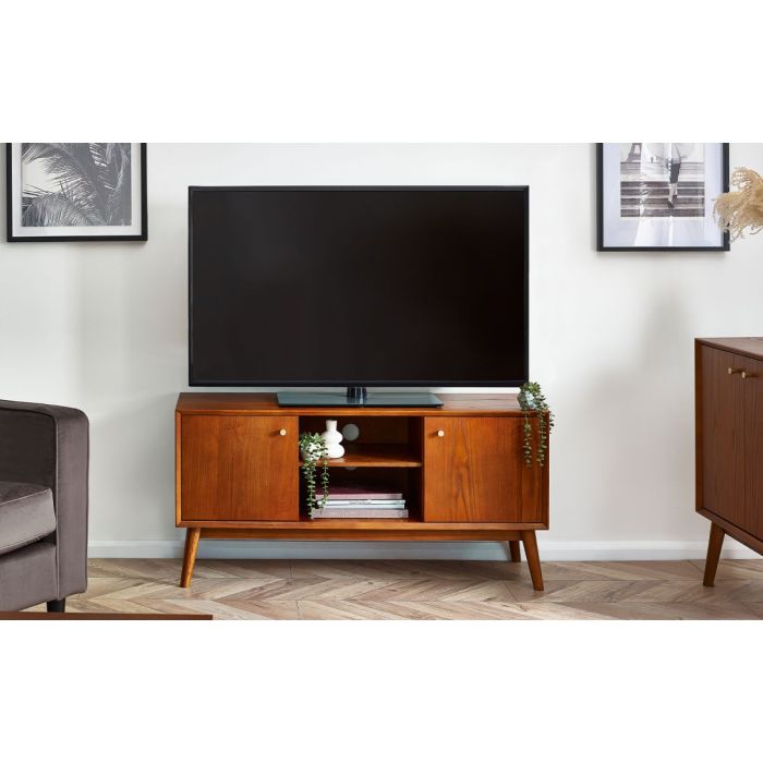 A gorgeous retro-inspired style, the Lowry Media Unit is constructed from an exquisite cherry ash wood veneer with beautifully tapered legs. Featuring 2 soft-touch cupboard doors with interior shelving. Offering the perfect storage space for consoles. Complemented by golden framed knobs, providing the perfect timeless staple to any occasional space.